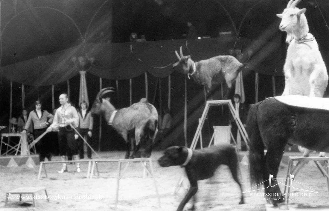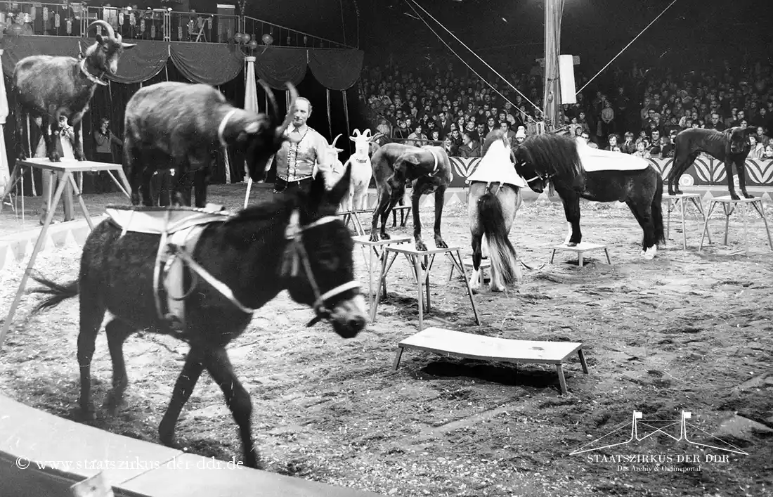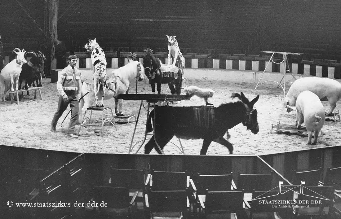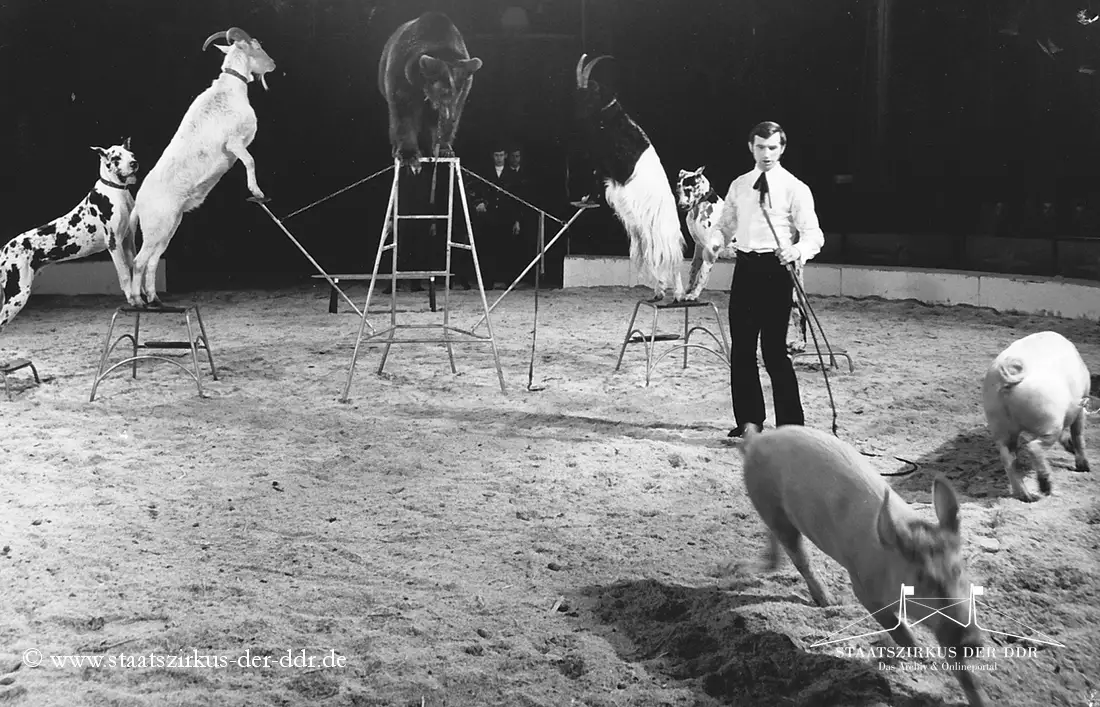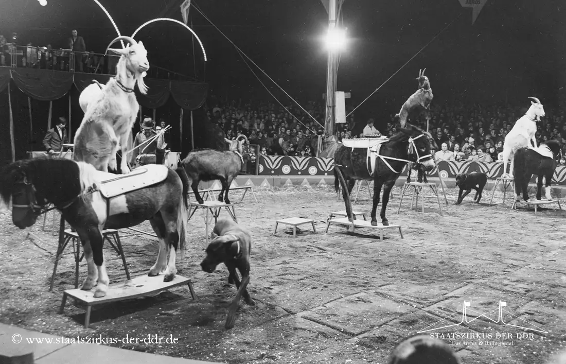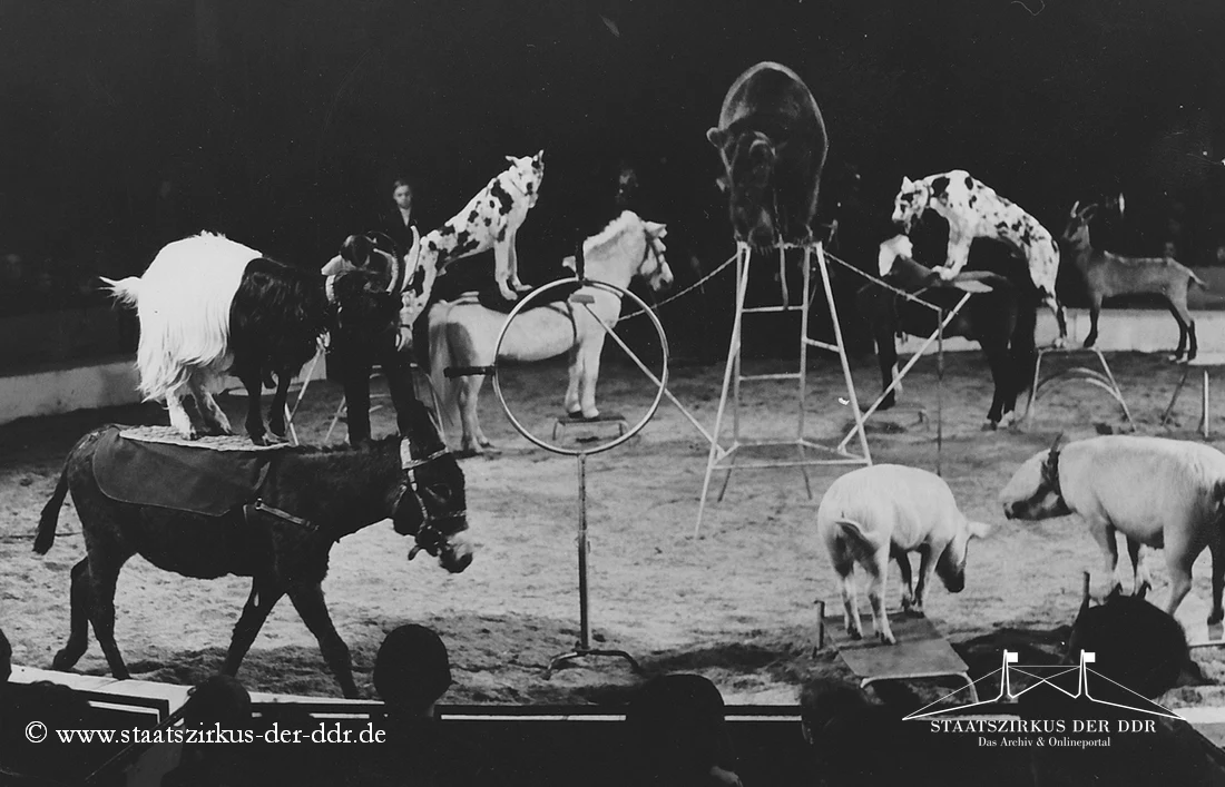 In drei Jahrzehnten präsentierten der VEB Zentral-Zirkus und später der Staatszirkus der DDR eine große Vielfalt an Exoten- und sonstigen Dressuren in der Manege. Von Tiernummern mit Kamelen, Zebras oder Straußen bis hin zu ungewöhnlichen Dressurformen reicht die überlieferte Bandbreite. In dieser Übersicht zeigen wir euch ausgewählte Darbietungen. Da viele historische Informationen nur bruchstückhaft überliefert sind, haben wir auf die Erstellung eigener Datenblätter verzichtet.
