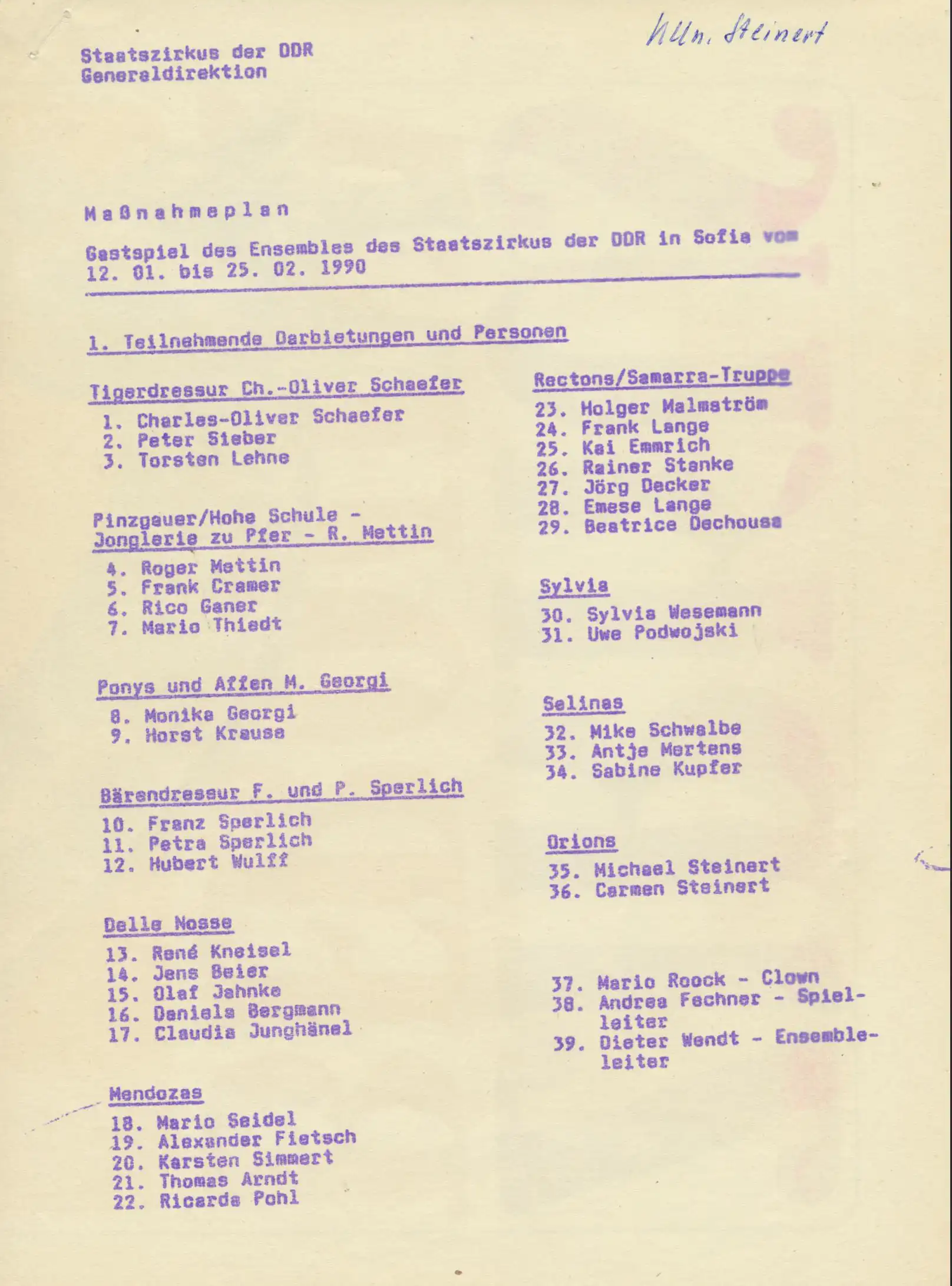 In dieser Übersicht geht es vor allem um die Einsätze, bei denen ganze künstlerische Ensembles entsandt oder im Austausch übernommen wurden. Die großen Auslandstourneen der Reisezirkusse mit eigenem Material findet ihr dagegen in den Jahresübersichten der Betriebsteile – genauso wie die Besetzungen ausländischer Gast-Ensembles innerhalb der DDR. Einzelauftritte von Dressuren, Artisten oder Truppen sind direkt den jeweiligen Darbietungen im Archiv zugeordnet.